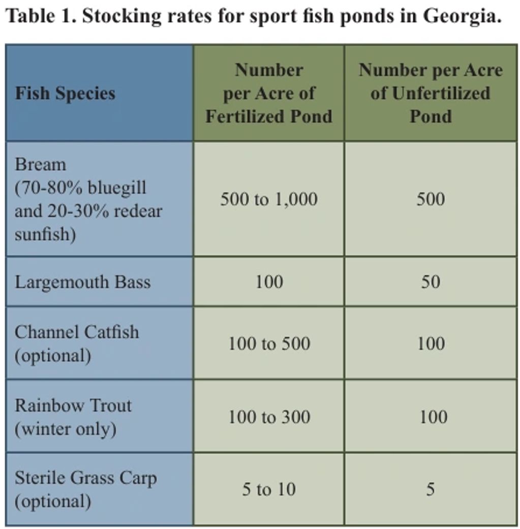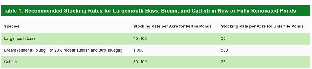 Alabama Extension Recommendations from their pond management guidelines for a new or fully renovated pond stocking of bluegill and others