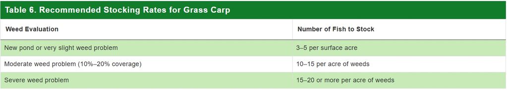 Alabama Extension Recommendations from their pond management guidelines for grass carp stocking for various vegetation density
